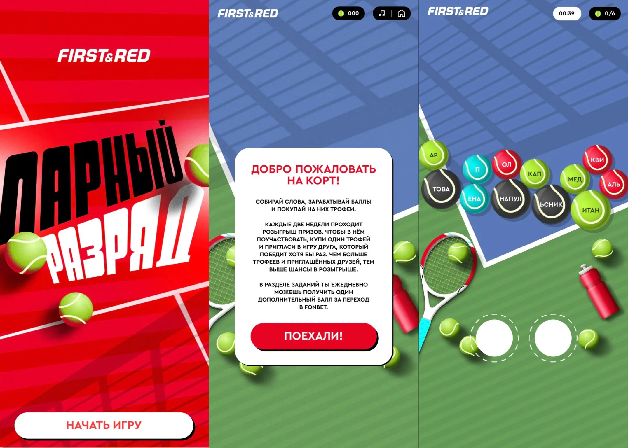 Механика выглядит следующим образом. На виртуальном корте разбросаны теннисные мячи, на каждом из которых написана часть слова (например: «АР», «ТОВА», «ЕНА», «НАПУЛ»). Задача участника — соединить две половинки так, чтобы получилось теннисное или спортивное понятие (например, «АР» + «ЕНА» = АРЕНА).