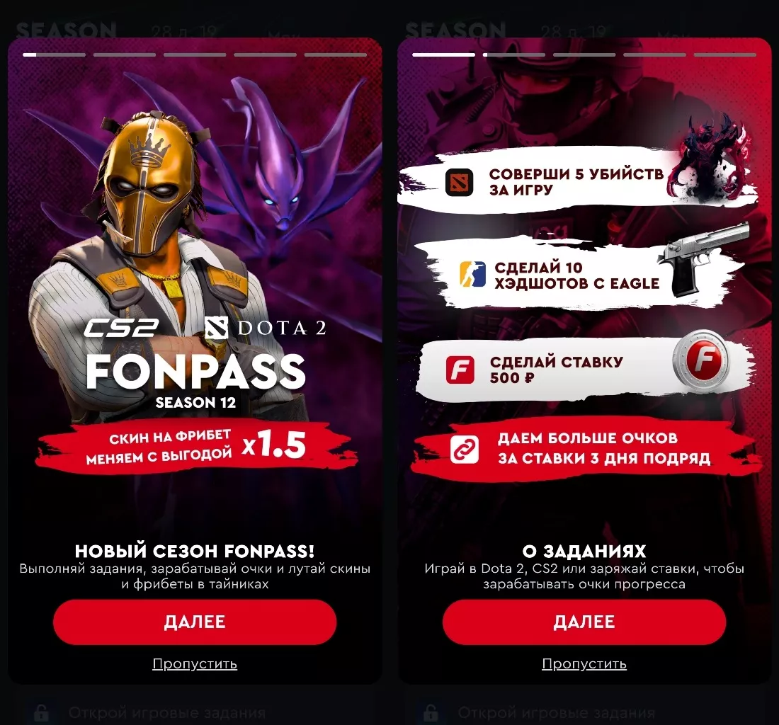 12-й сезон турнира FONPASS уже стартовал! В интерактиве для поклонников киберспорта добавлены новые задания для CS2 и Dota 2. Прямо сейчас ты можешь выбрать режим игры, начать проходить интерактив, зарабатывать баллы и обменивать на скины или фрибеты.