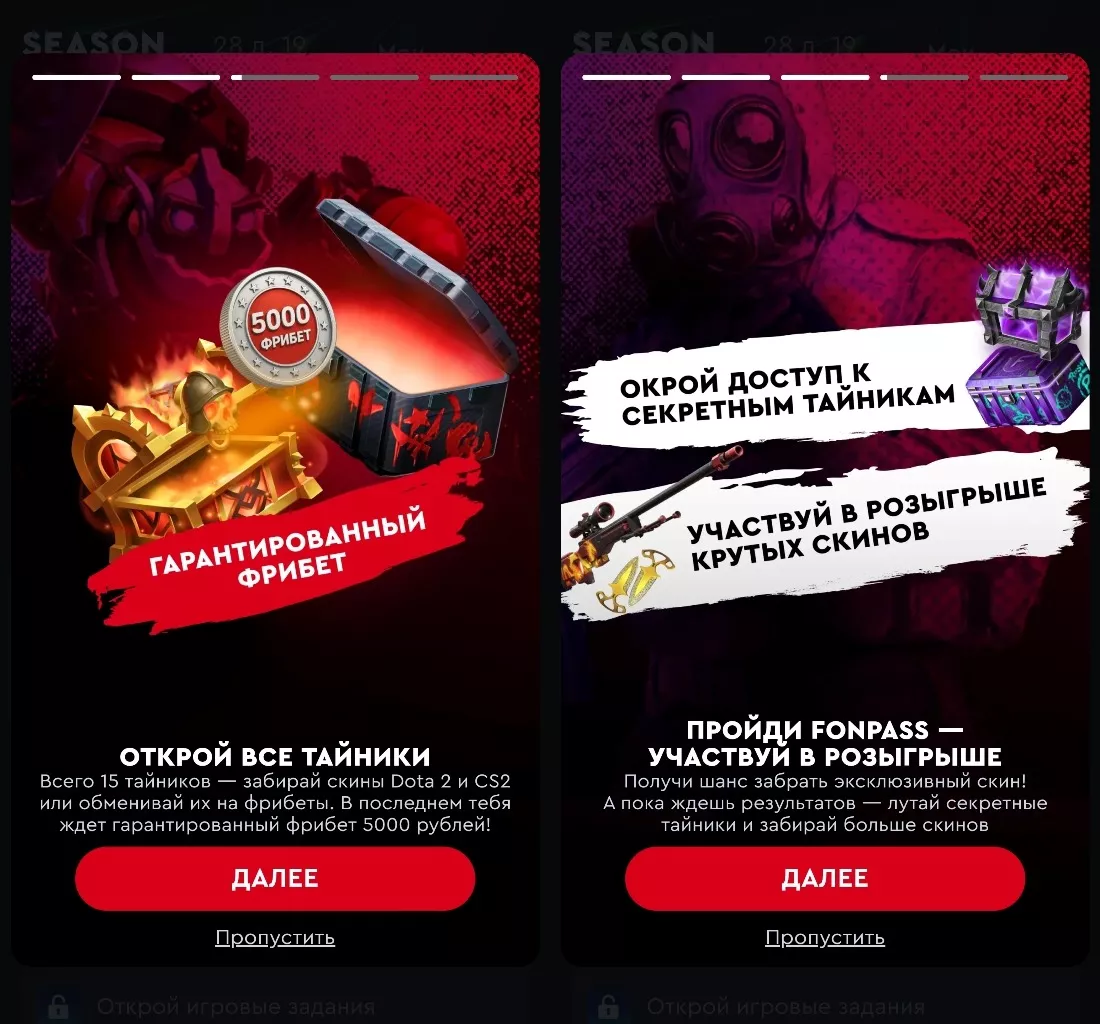 FONPASS - интересная акция для любителей ставок на киберспорт. Она дает возможность выиграть игровые предметы, скины и фрибеты, просто выполняя задания. Новичкам разобраться в интерактиве от Фона очень легко. Задания на первом этапе довольно простые, где-то даже не нужно тратить деньги. А чтобы добраться до первого кейса, нужно набрать всего 300 поинтов. Однако, для получения максимальной выгоды, придется делать ставки на спорт. В противном случае достичь максимального уровня с самыми ценными шкатулками не получится.