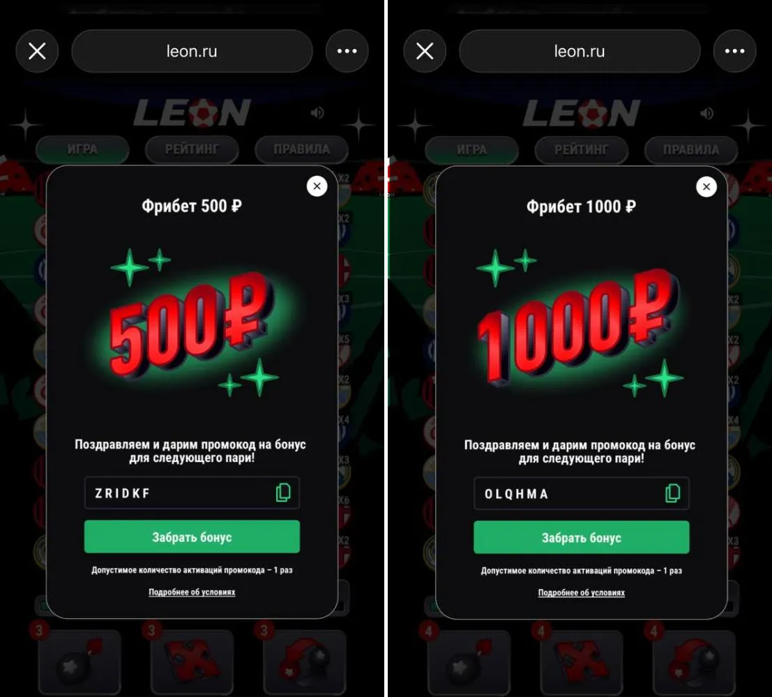 После прохождения 5 и 10 уровня игры участники получают промокоды на фрибеты до 1000 рублей.