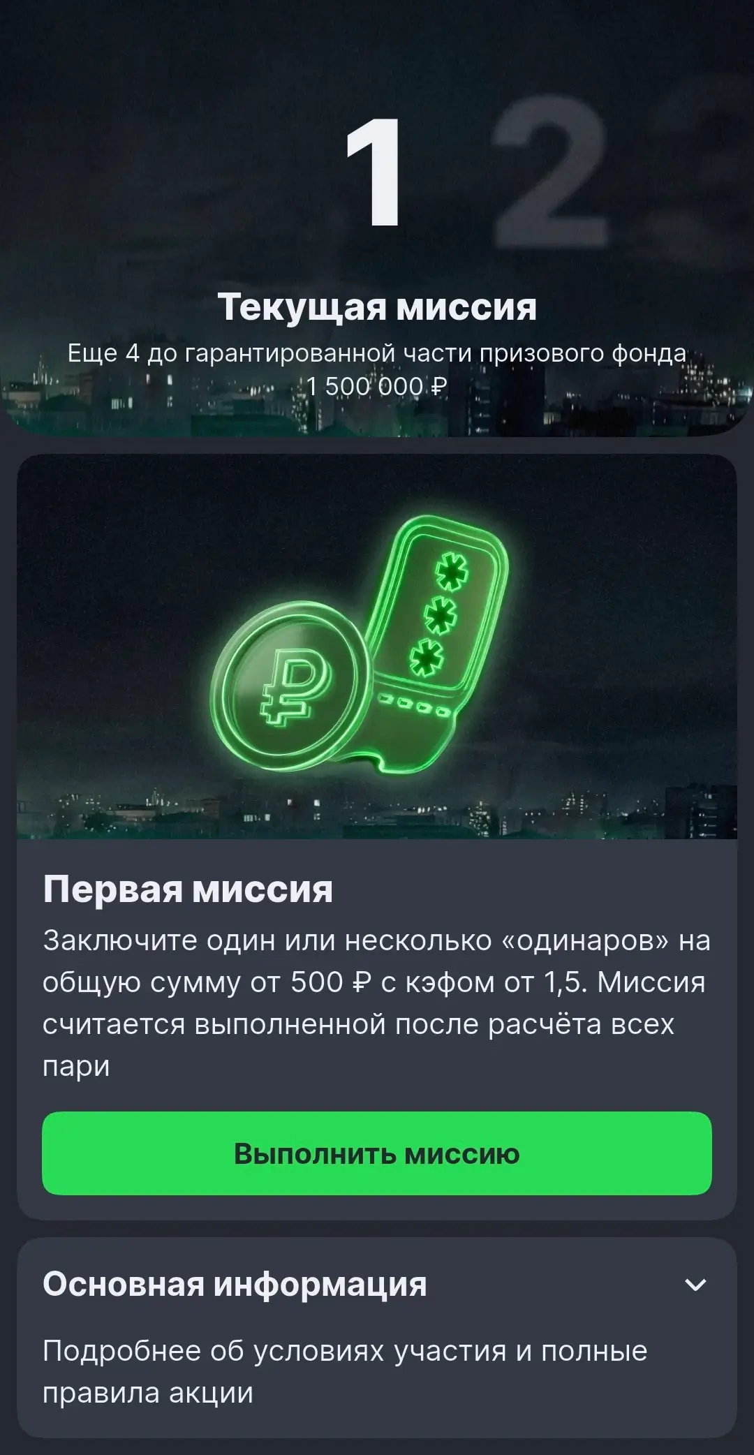 Миссия может выглядеть следующим образом: заключить пари типа «ординар» на сумму от 500 рублей с коэффициентом от 1.50.