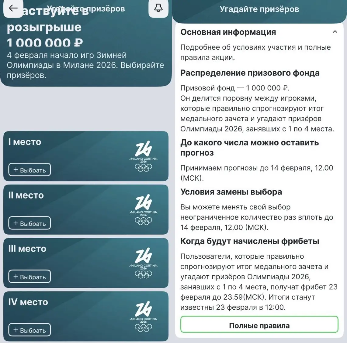 Минимальный фрибет для угадавшего — 500 ₽, а максимальный — 300 000 ₽.