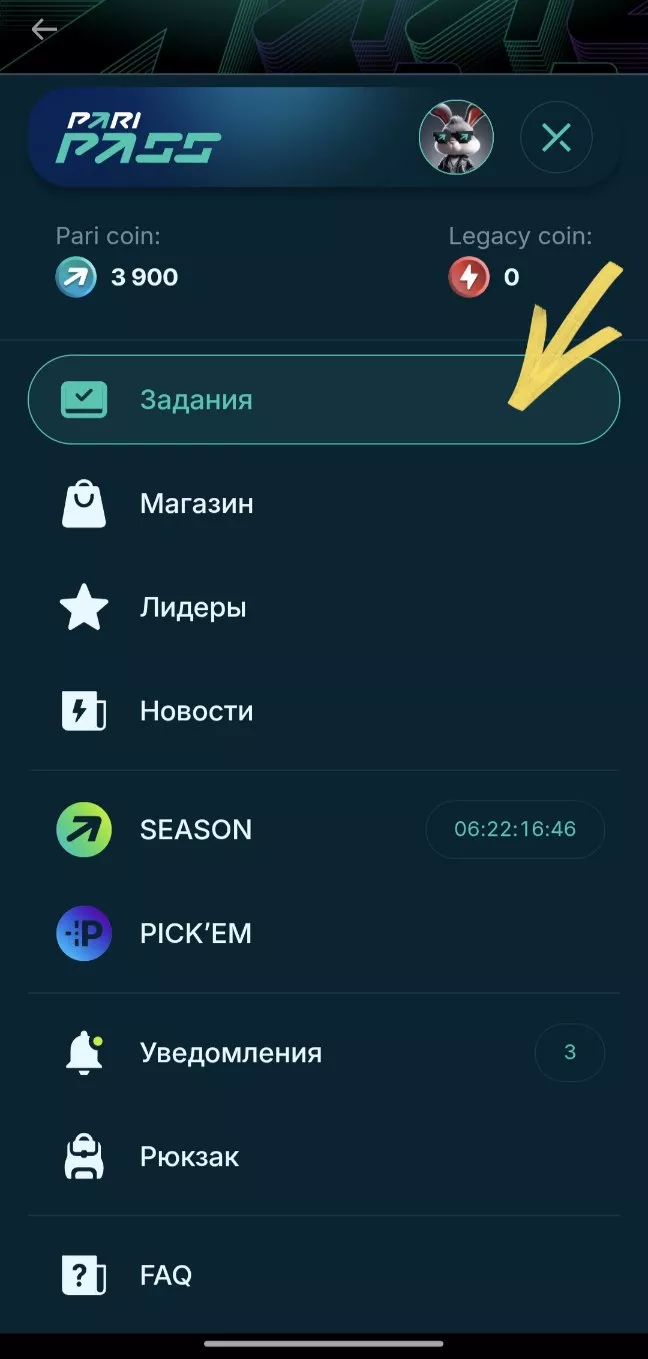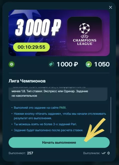 - Перейти в PARI Pass и выбрать задание со ставкой на ЛЧ