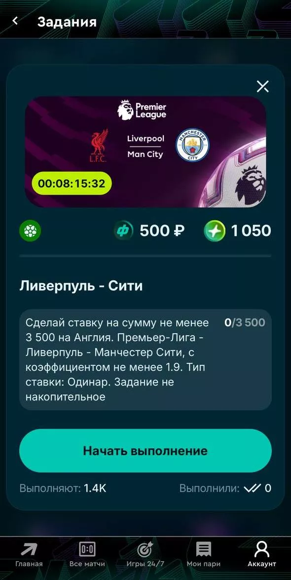Перед тем, как оформлять квалифицирующую ставку, обязательно открой задание в разделе Пари Пасс и нажми «Начать выполнение».