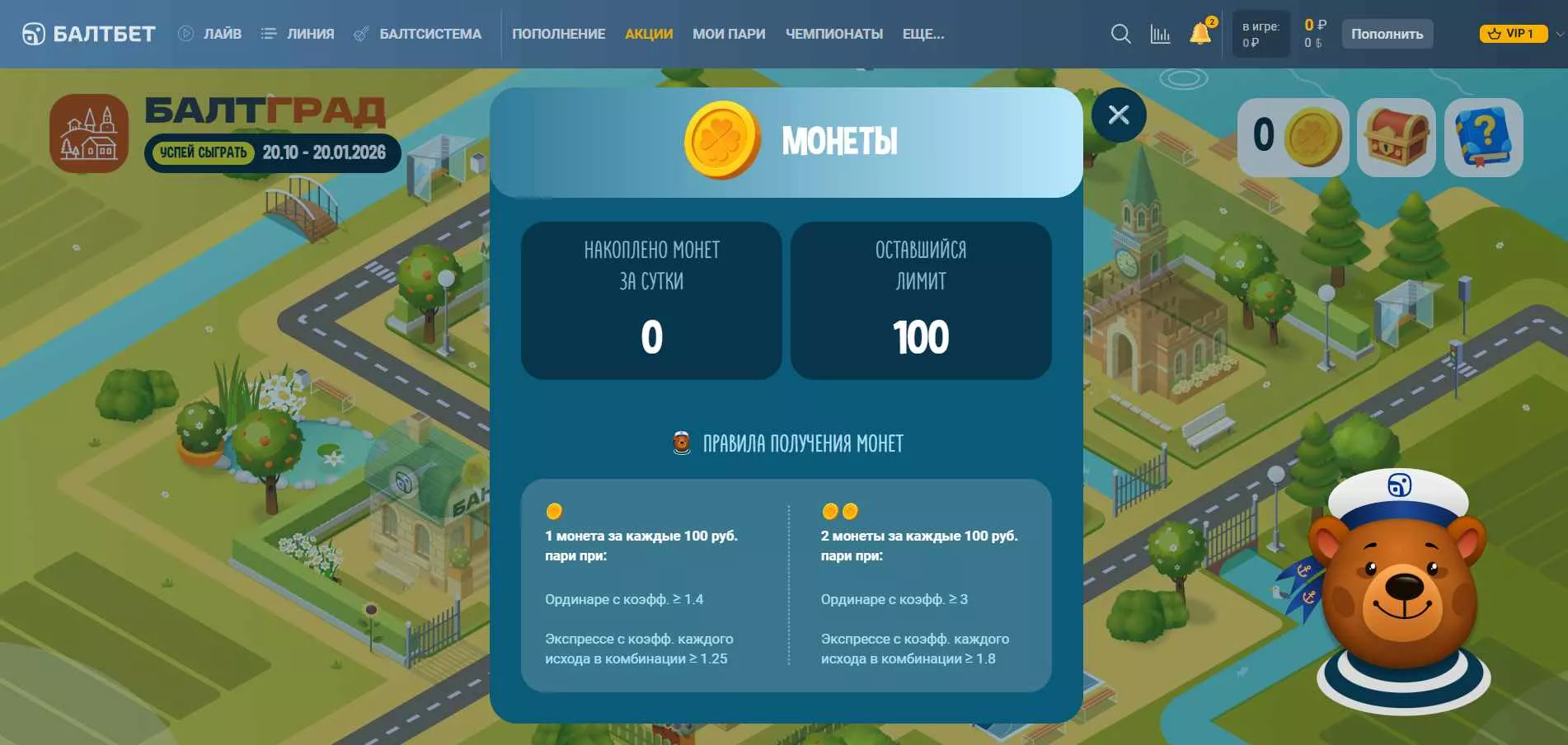 Игровая валюта начисляется только за ставки. 1-2 монеты будут начислять за каждые проставленные 100 рублей. Коэффициент зависит от категорий зданий. Например, 1 категория — ординары с кэфом от 1.40 до 3.00, 4 категория — экспрессы с исходом от 1.80.