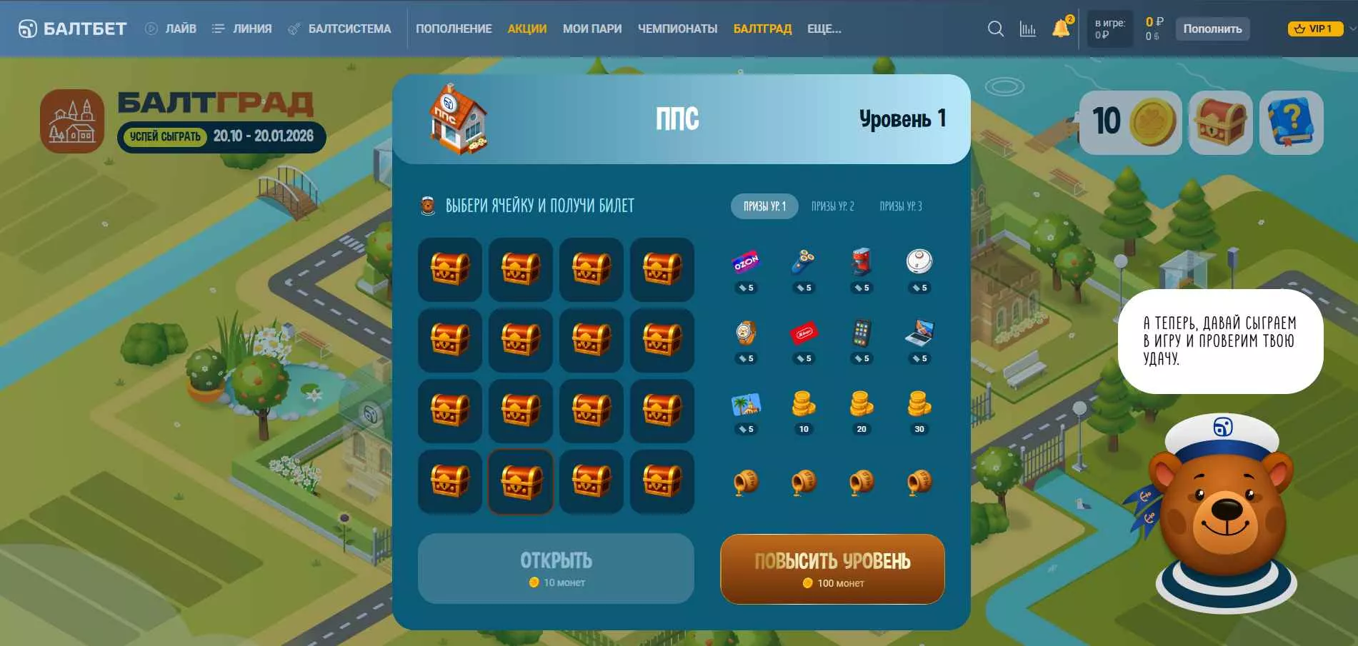 БалтГрад — новый интерактив букмекера Балтбет, победители которого получат фрибеты от 500 до 1500 рублей, автомобиль Москвич 3, гаджеты Apple и другие призы. Игра доступна на сайте и в приложении БК. Призовой пул акции — 25 000 000 рублей.