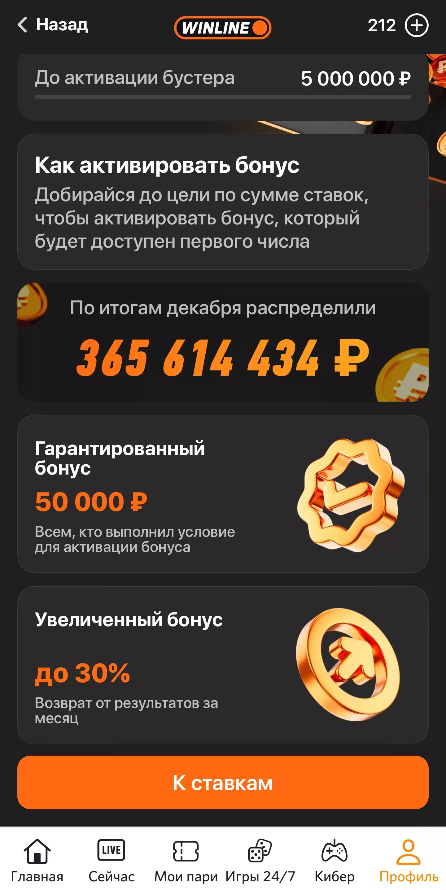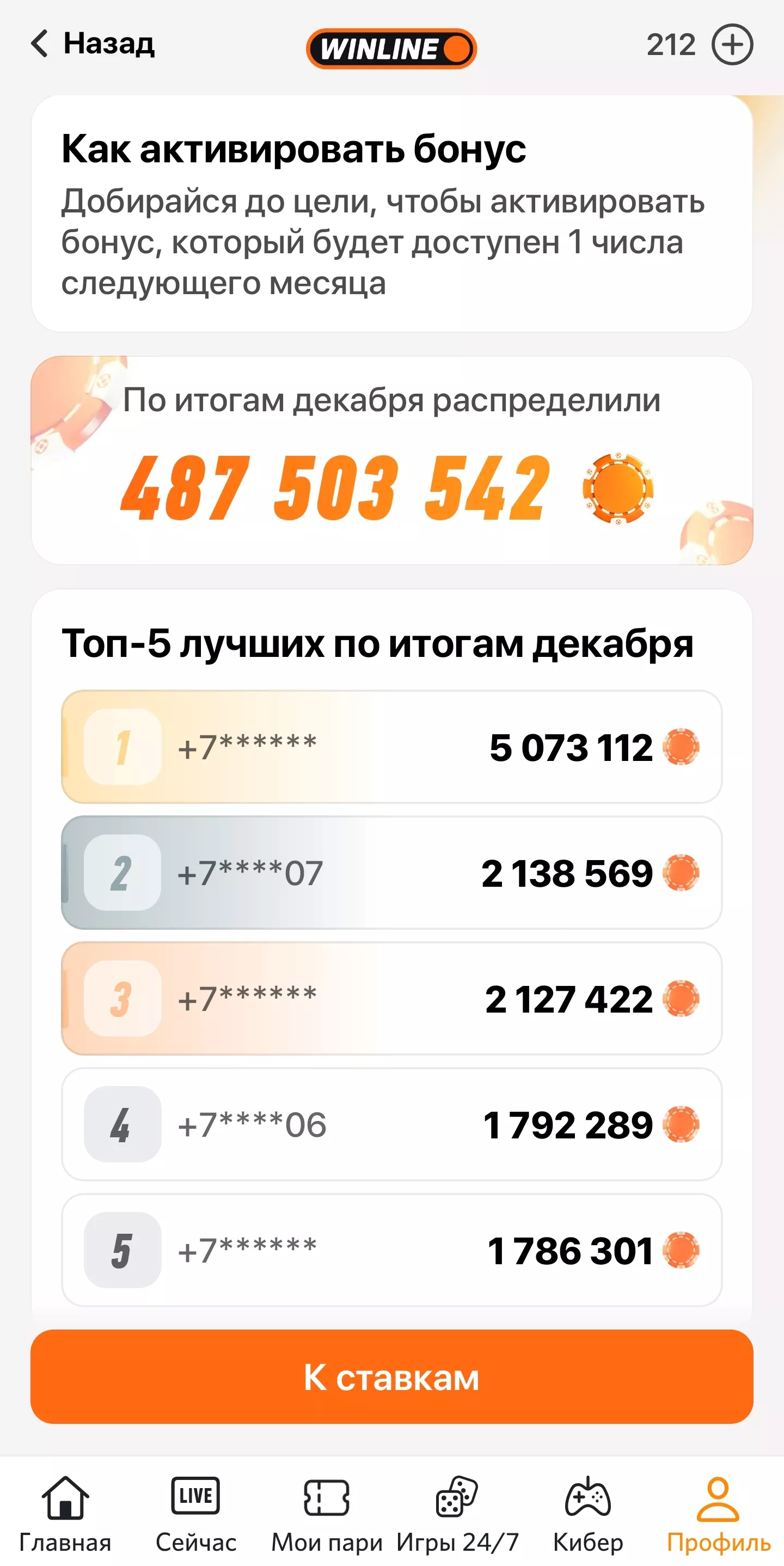 По итогам декабря Winline распределил бонусы за активность на сумму 487 503 542 рублей.