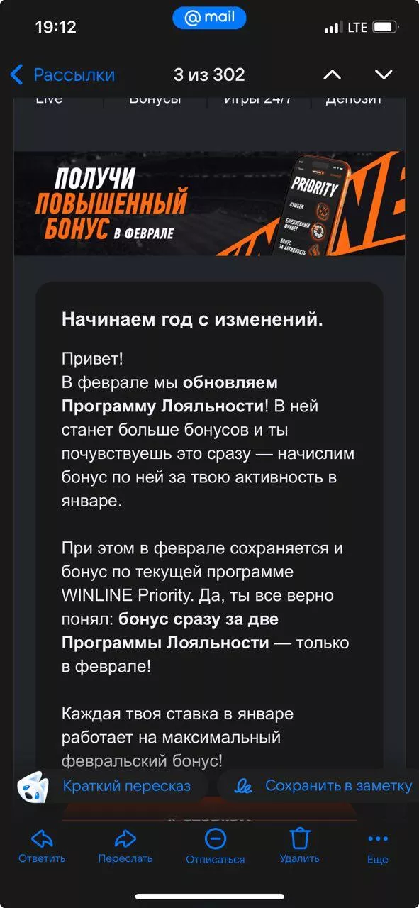 Один из наших подписчиков сообщает, что Winline собирается увеличить выплаты по программе лояльности в феврале и, возможно, изменить ее условия в целом. Об увеличенном бонусе букмекер сообщил некоторым клиентам в email-рассылке. Ждем официальный релиз.