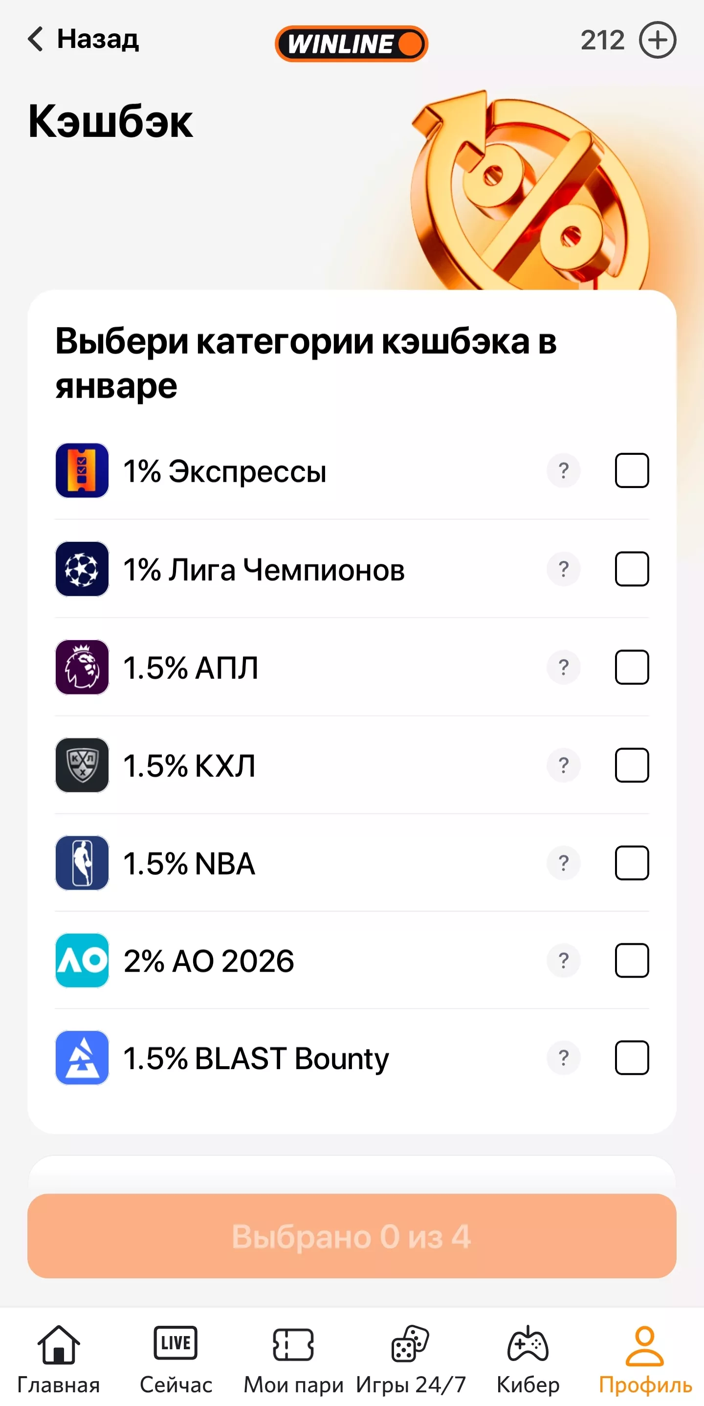 - Шкала прогресса в личном кабинете Winline показывает, сколько пользователю осталось до активации бонуса.