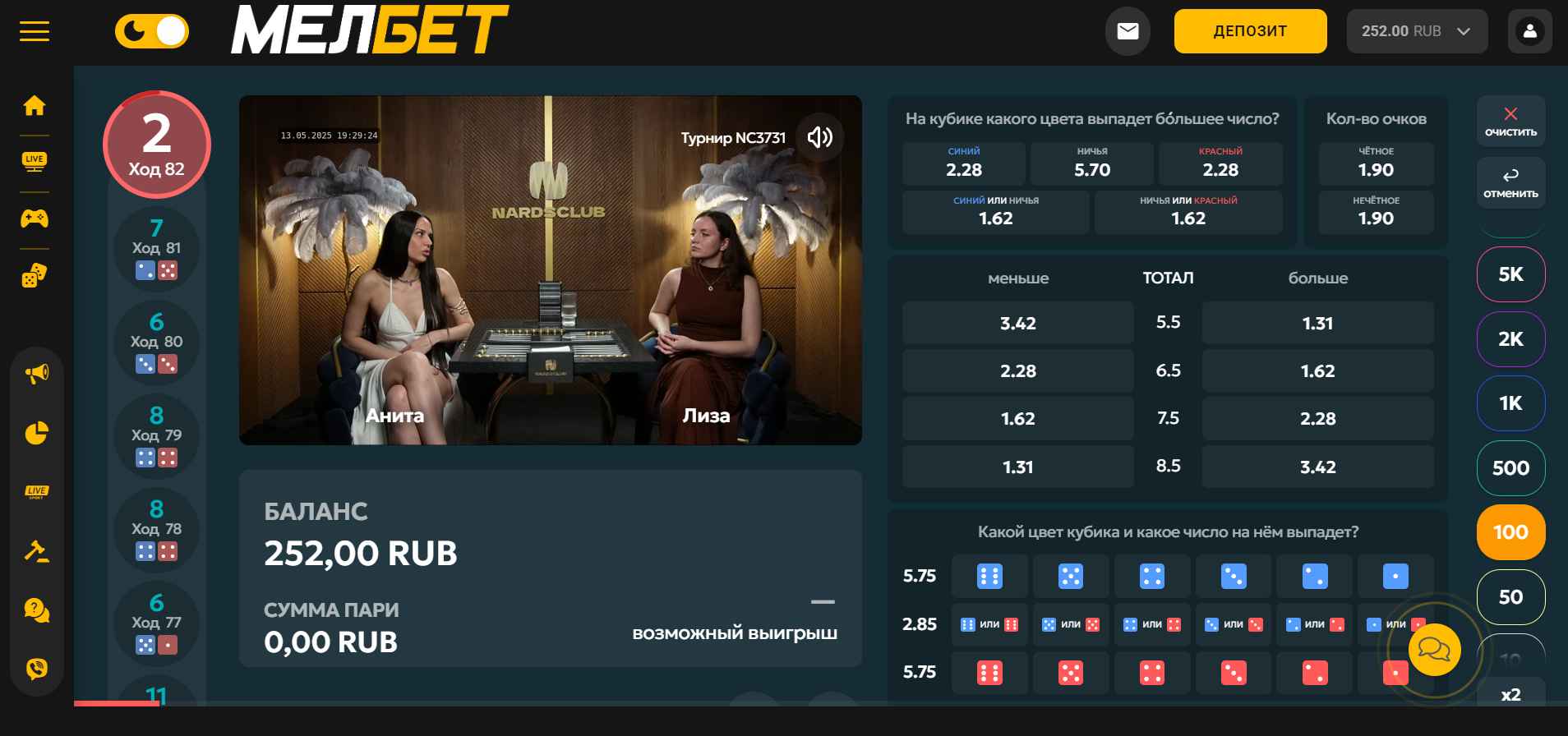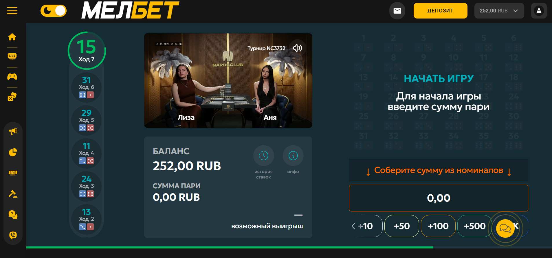 Быстрые игры Мелбет — разные вариации ставки на нарды с ускоренным расчетом ставки. Пользователям доступно 4 игры: Нарды, Нарды 36, Нарды 21 и Нарды.Сапер. Они находятся в разделе «Игры 24/7». Минимальная ставка составляет 10 рублей, а темп не дает заскучать. Далее мы подробно расскажем о каждой игре.