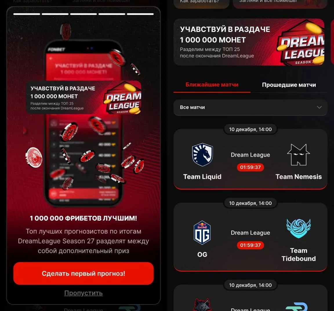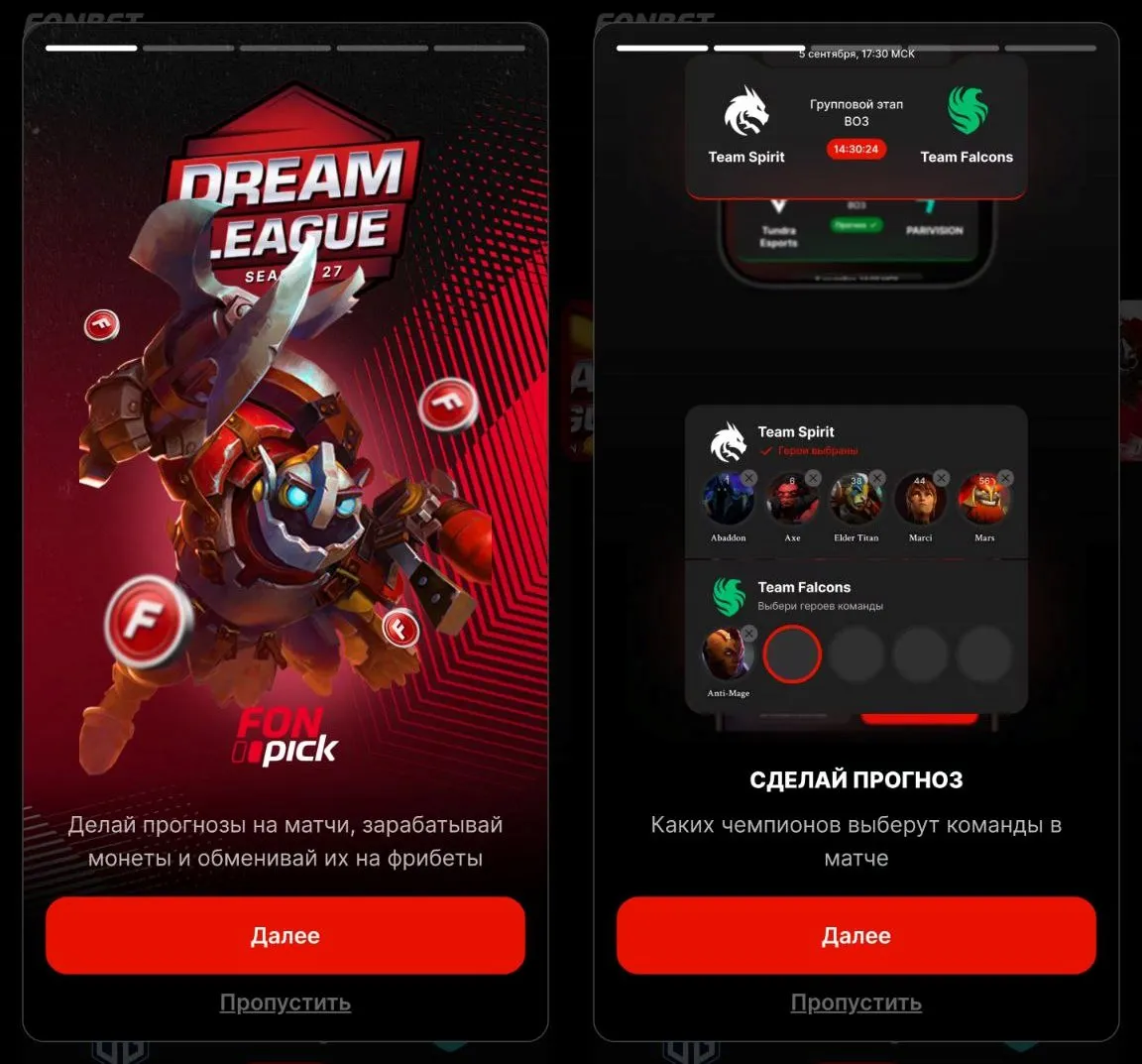 FONBET Pick'em — бот-предиктор для фанатов Dota 2, в котором можно предсказывать драфты в матчах турнира DreamLeague Season 27 и выигрывать призы за каждую карту. Самые проницательные аналитики получат фрибеты от 100 до 1 000 000 рублей.