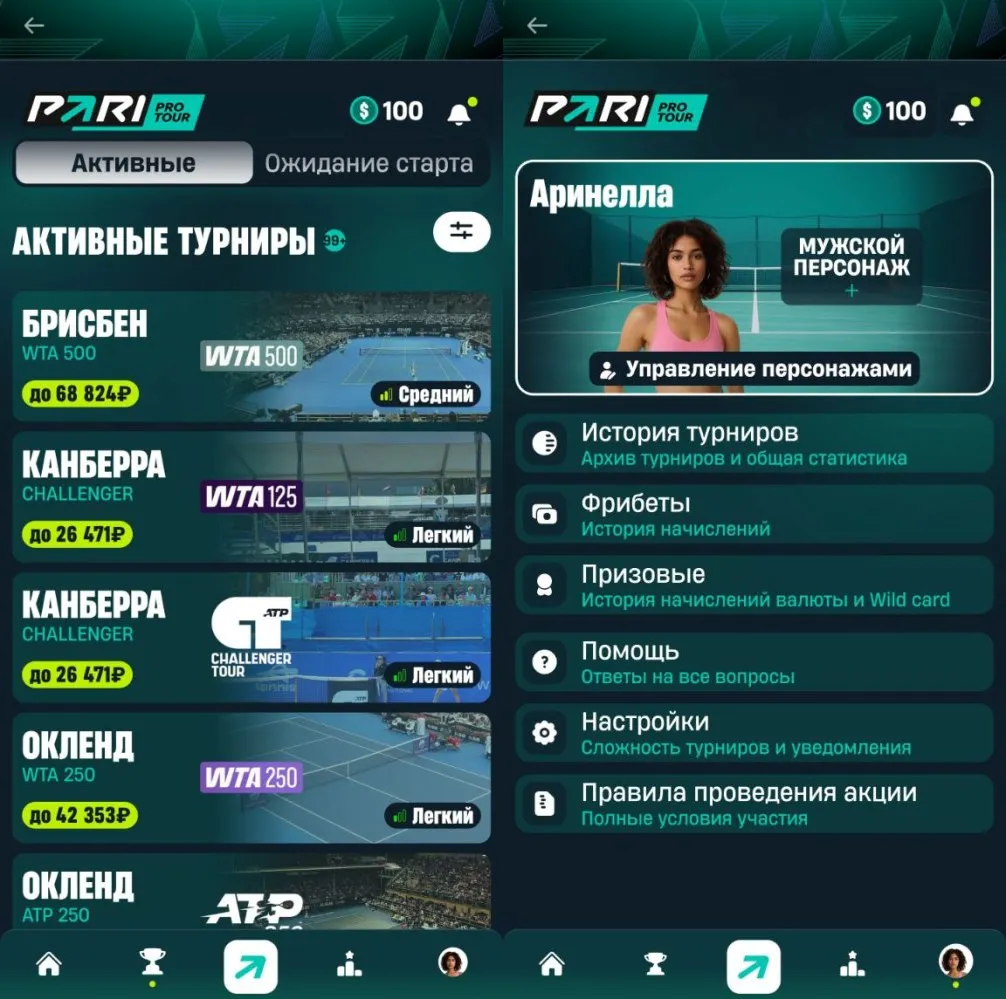 Pro Tour (2 сезон) — теннисная акция в мобильном приложении букмекерской конторы Пари с фрибетами до 5000 рублей. Это совершенно новый и уникальный интерактив, фишка которого заключается в масштабной геймификации в стиле Sims. Пользователи могут создавать персонажей (теннисистов), участвовать в турнирах и получать реальные награды.