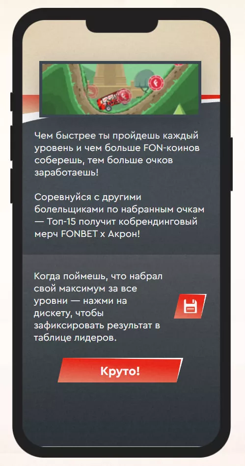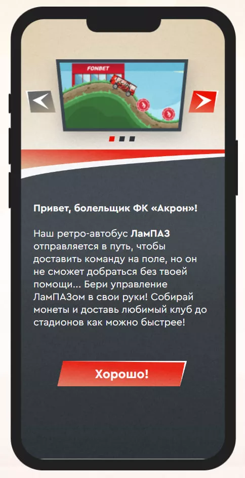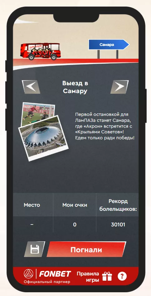 «Дорога яркости» — зимняя диджитал-игра от Фонбет и ФК «Акрон», созданная по мотивам легенды 2000-х — Gravity Defied. Игроков ожидают выезды по мотивам турне: в Самару, Казань, Ростов-на-Дону, Москву и Санкт-Петербург. Нужно управлять ЛамПАЗом и собирать FON-коины. Больше баллов — выше шанс на выигрыш подарка. На кону призовые фрибеты на 3 000 000 рублей для победителей и 15 футболок от ФК Акрон.