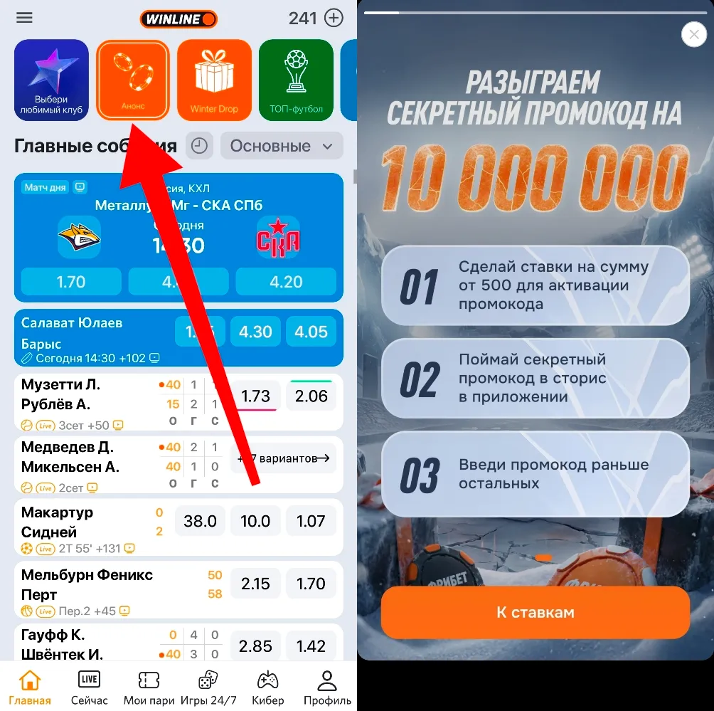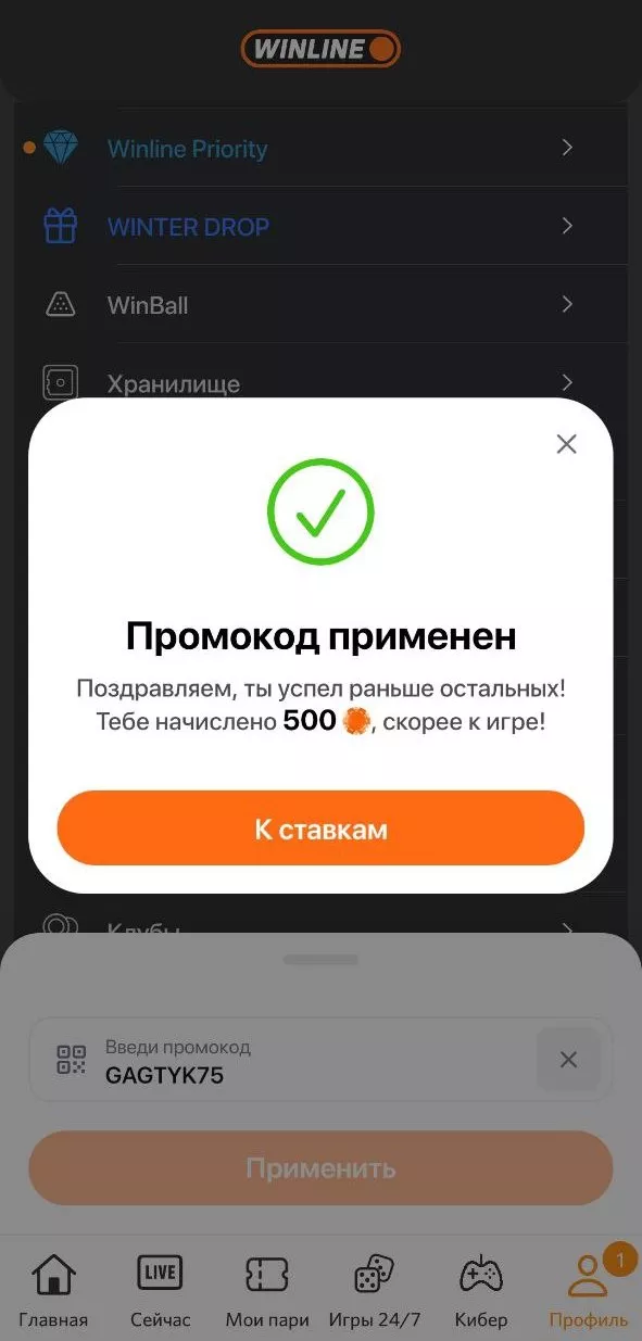 20 января Винлайн проведет 3 розыгрыша с секретными промокодами по 3 000 000 ₽ в сторис. 1 розыгрыш пройдет в 19:00 по мск, второй — в 21:00 по мск, третий — в 23:00 по мск. Для активации промокодов нужно сделать оборот ставок 1000 ₽, 5000 ₽ и 10 000 ₽ за сегодня.