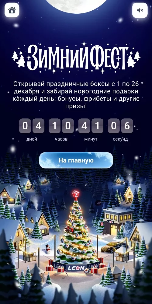 Зимний фест — масштабная новогодняя акция в букмекерской конторе Леон с ежедневными фрибетами и бонусами. На протяжении всего декабря БК будет раздавать подарки к Новому году. Во время Зимнего Феста игроков каждый день ждут праздничные боксы с призами. Внутри можно найти безусловные фрибеты, страховки пари и бонусы на депозит.