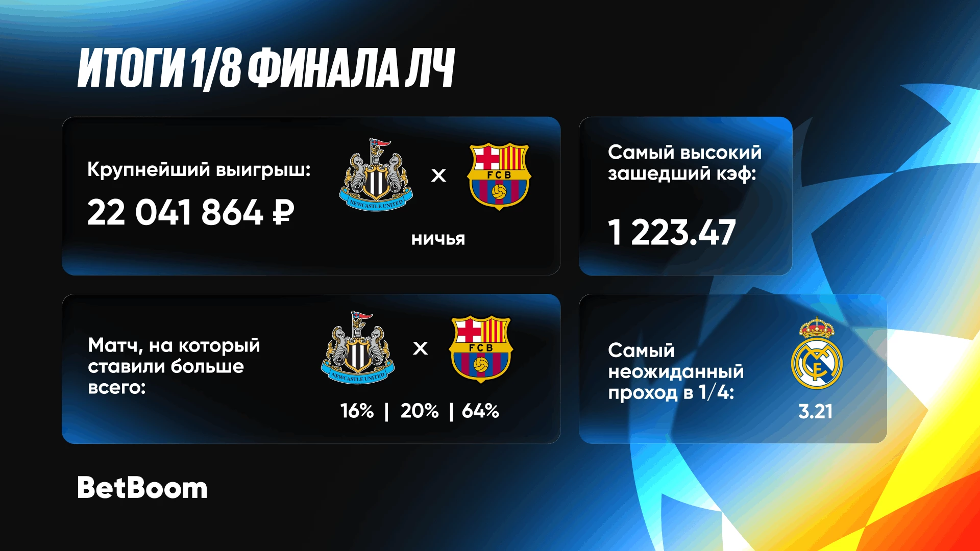 Букмекерская компания BetBoom подвела итоги стадии 1/8 финала Лиги чемпионов УЕФА. Самый крупный выигрыш был зафиксирован по ставке на ничью в первом матче между «Ньюкаслом» и «Барселоной» с коэффициентом 3.90.