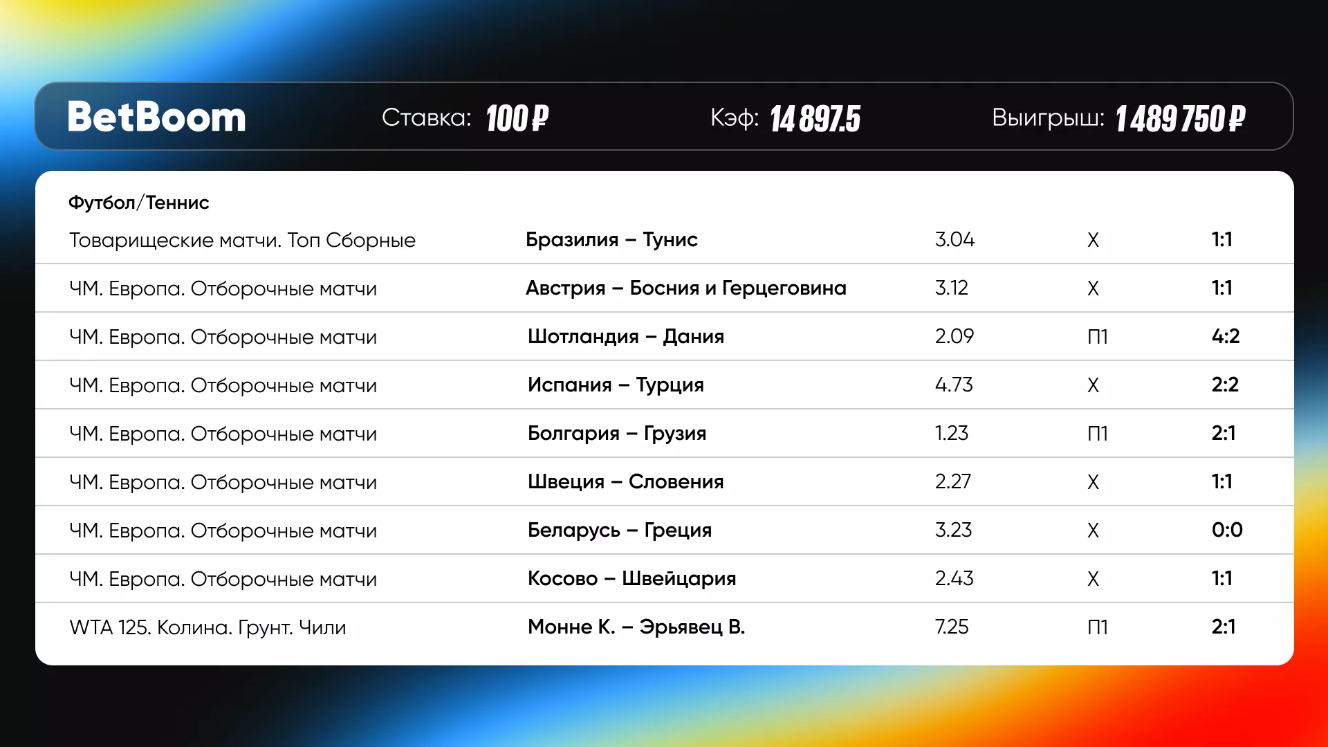 Международная пауза оказалась удачной для пользователя BetBoom. Он собрал экспресс из девяти событий на исходы встреч национальных команд, а также включил матч турнира WTA в Колине между Монне и Эрьявец. Удачный купон принёс беттору 1 489 750 рублей при ставке всего 100 рублей.