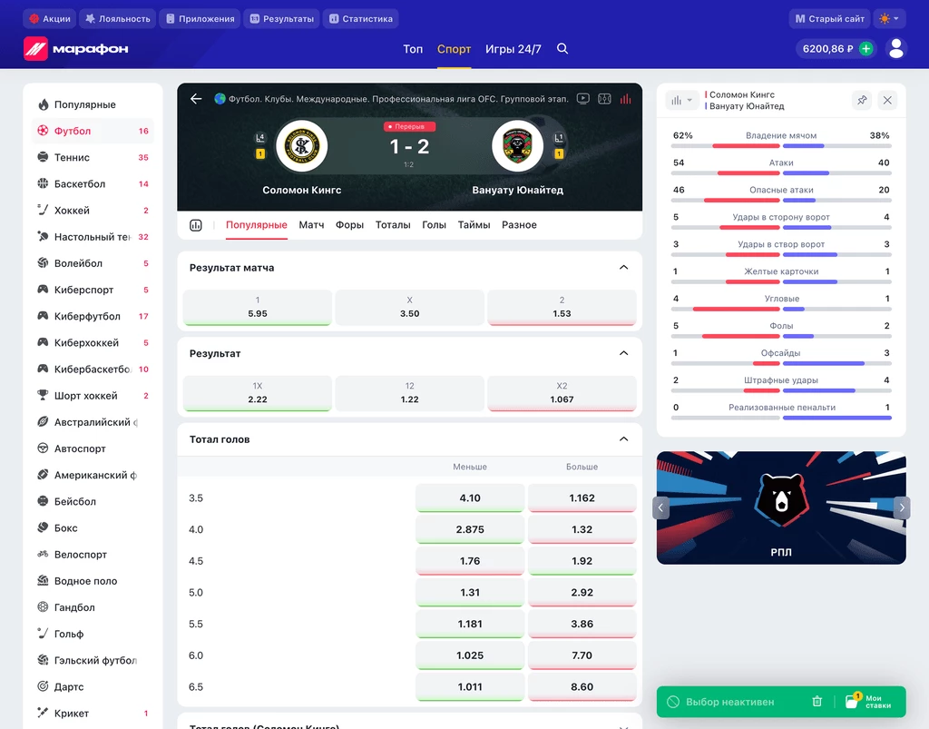 В новой версии расширены инструменты статистики. Пользователи могут оперативно оценивать форму команд, отслеживать ключевые показатели и следить за ходом матча в режиме реального времени. Доступны лайв-статистика и данные о личных встречах, что помогает принимать более обоснованные решения — особенно в лайв-ставках.
