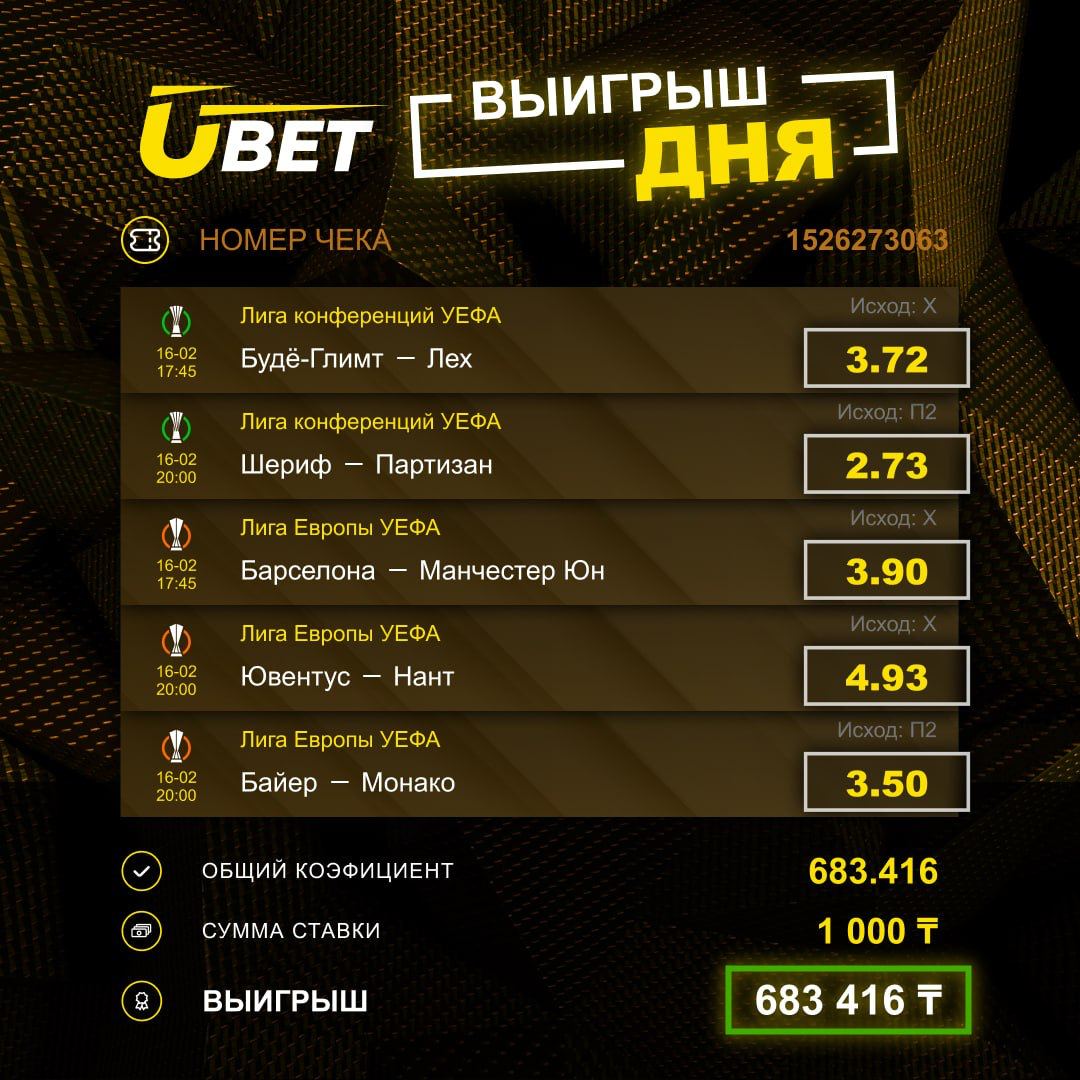 У одного из клиентов букмекерской компании Ubet.kz залетел просто нереальный экспресс. Беттор собрал пресс из пяти событий Лиги Европы и Лиги конференций, поставив 1000 тенге. Суммарный коэффициент составил 683, и ведь он сыграл!